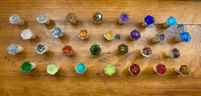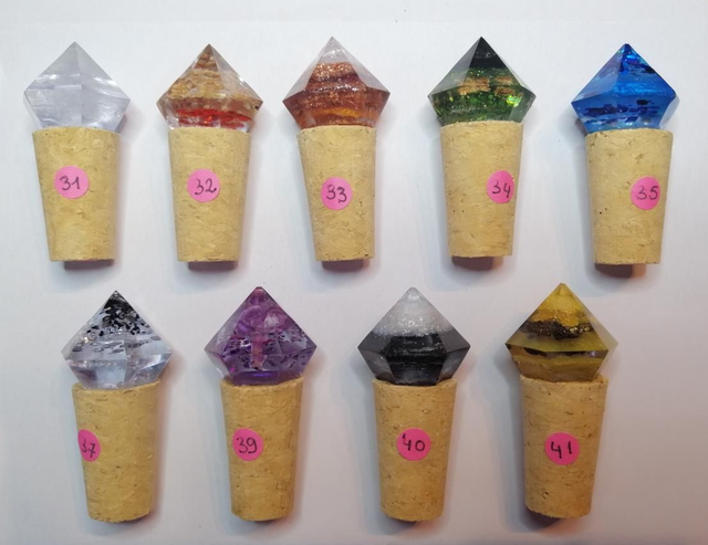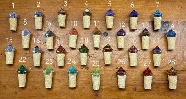 Le pied en liège est conique (de 1,6 cm en bas à 2,3 cm en haut). Décoration en forme de Diamant en résine (différents motifs et couleurs).