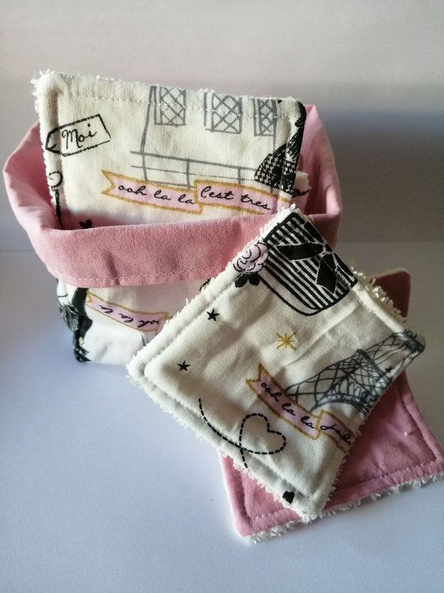 Ensemble de 10 carrés démaquillants EPONGE avec panière assortie en coton.