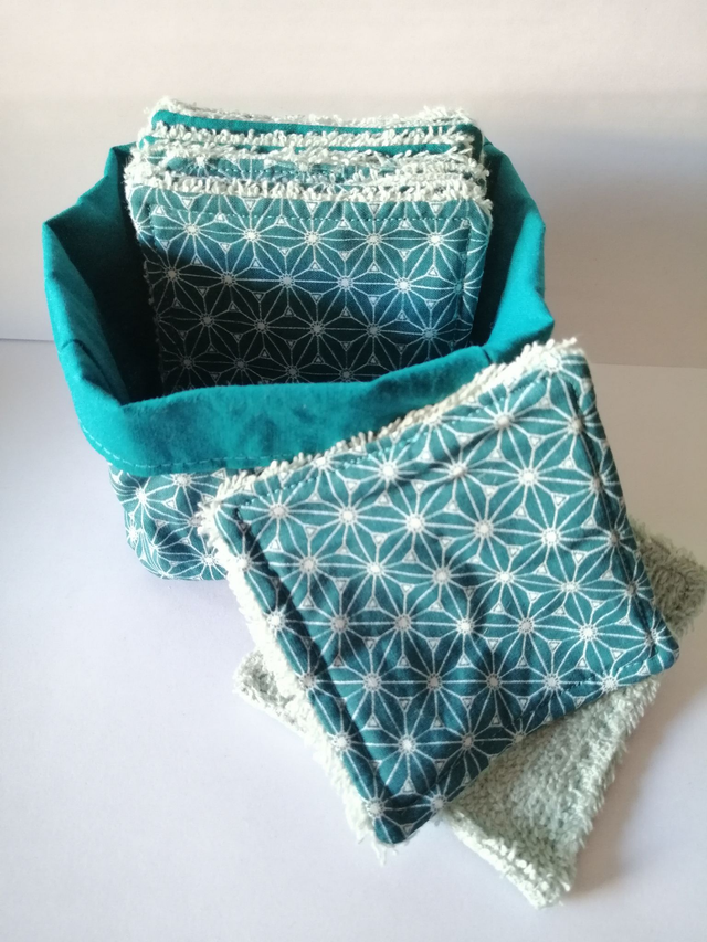 Ensemble de 10 carrés démaquillants EPONGE avec panière assortie en coton.