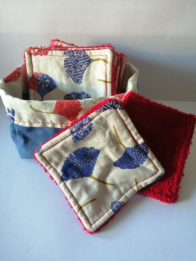 Ensemble de 10 carrés démaquillants EPONGE avec panière assortie en coton.