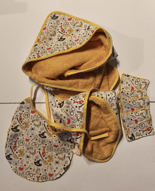 Coffret Naissance (Harry Potter), tout coton et éponge, comprenant 1 cape de bain, 1 bavoir et 4 lingettes. Petit sachet de lavande (du jardin) assorti en cadeau.