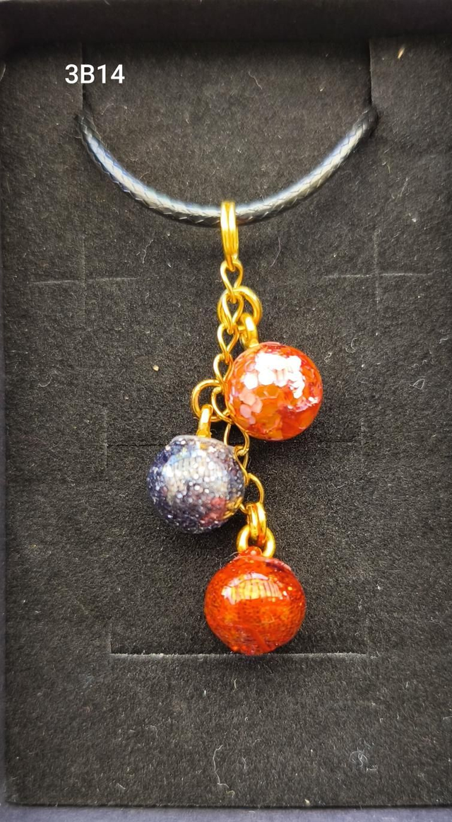 Collier 3 Breloques de mini-boule en verre (avec paillettes emprisonnées dans de la résine). Chaque mini-boule est remplie à la main, chaque collier est donc unique et ne ressemble à aucun autre.