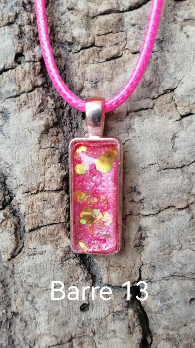 Collier "Barre" rectangulaire en acier inoxydable avec fond en Mica (pigment minéral). Cordon en coton ciré tressé (50cm avec chaîne d'extension de 5cm)