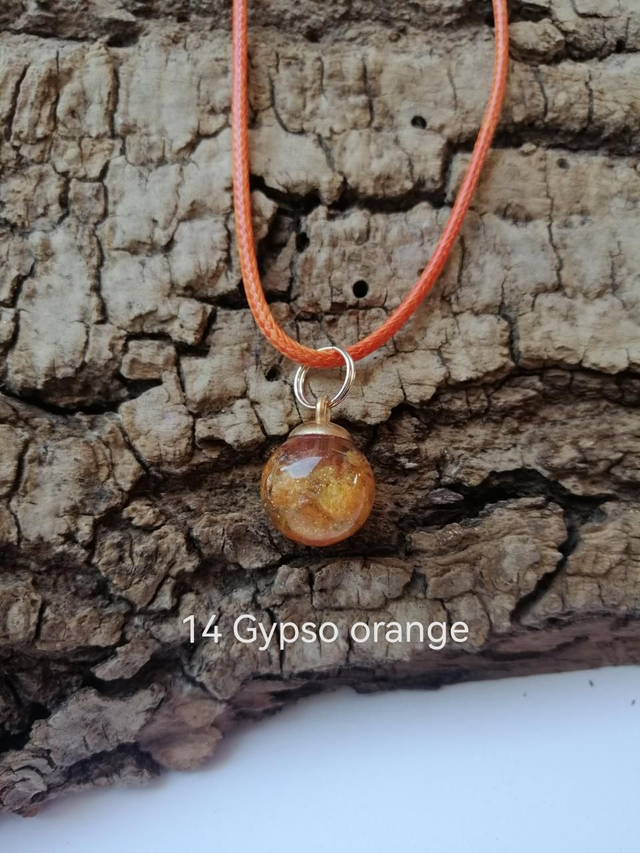 Collier Boule en Verre (avec différentes matières emprisonnées : minérales ou végétales). Gypsophile orangé