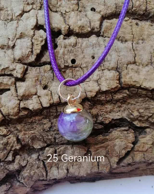 Collier Boule en Verre (avec différentes matières emprisonnées : minérales ou végétales). Fleur de géranium