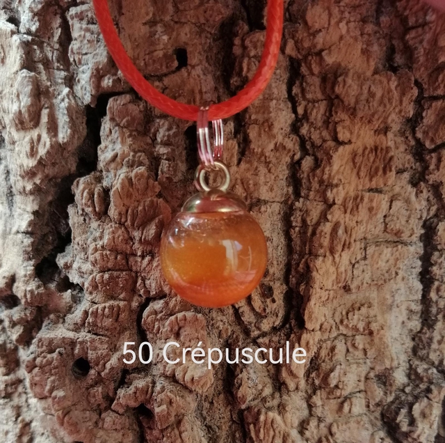 Collier Boule en Verre (avec différentes matières emprisonnées : minérales ou végétales). Paillettes orangées