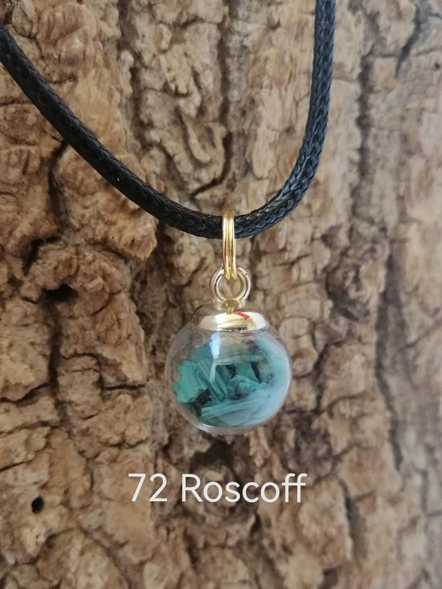Collier Boule en Verre (avec différentes matières emprisonnées : minérales ou végétales). Spiruline