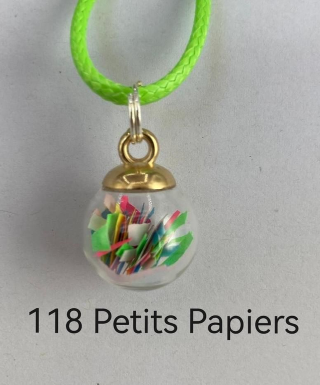 Collier Boule en Verre (avec différentes matières emprisonnées : minérales ou végétales). Petits papiers colorés