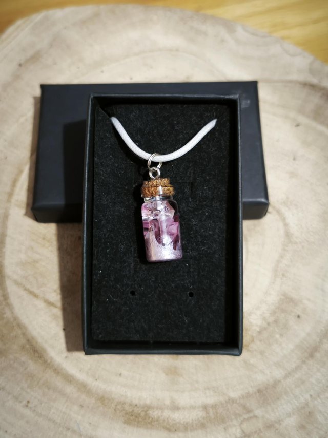 Fiole en verre format pendentif (avec fleur emprisonnée dans de la résine).