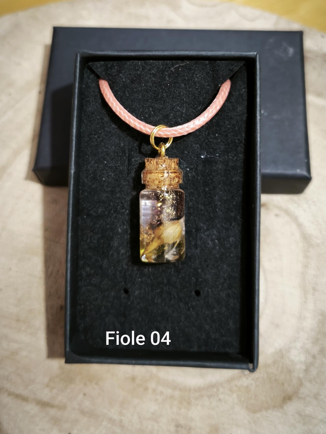 Fiole en verre format pendentif (avec fleur emprisonnée dans de la résine).