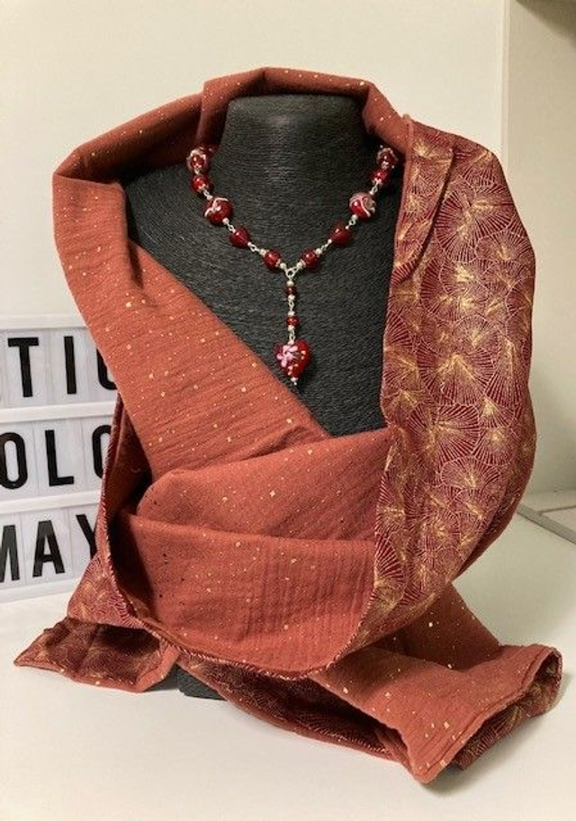 Echarpe double-gaze de coton terracotta aux motifs dorés en coton au verso, 1.40m