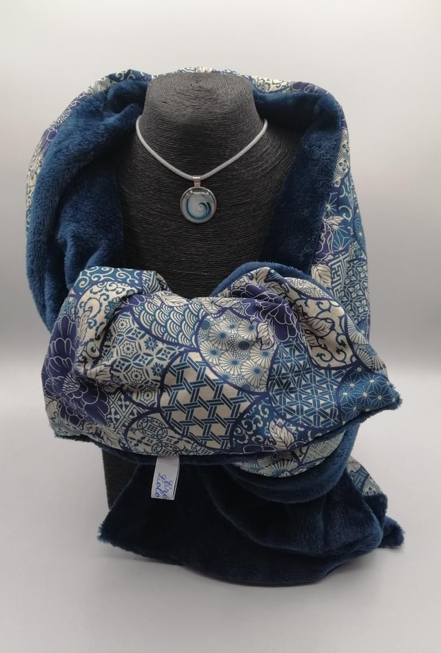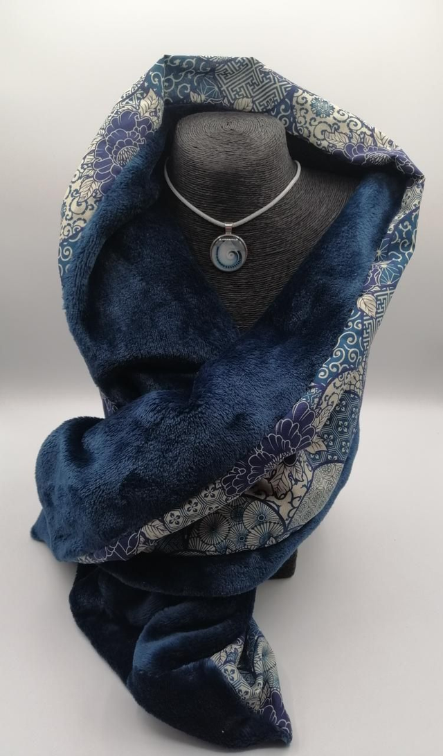 Echarpe polaire bleue avec tissu pivoines et motifs géométriques bleus , 1,50mx26cm. Douce et chaude. Lavage à 30°
