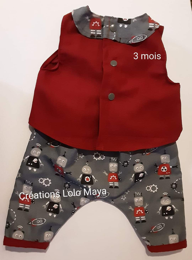 Ensemble Sarouel 3 mois "Robots" (haut et bas assortis), tout coton. L'ensemble à 35€ au lieu de 37€ (remise de 2€).