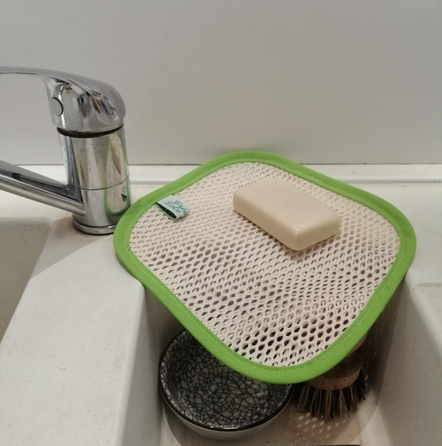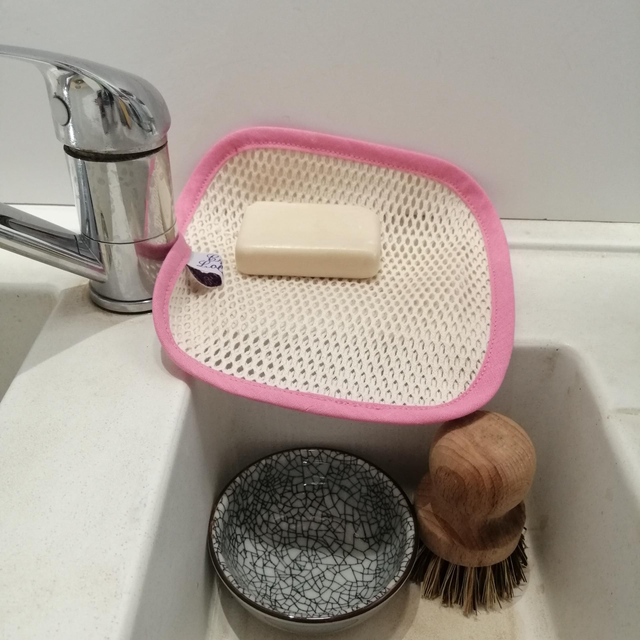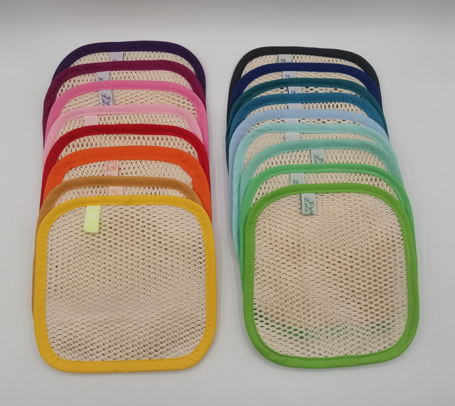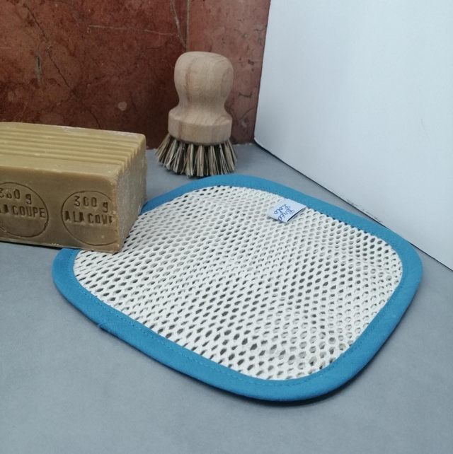 Éponge à vaisselle en tissu-maille de coton réutilisable lavable. Biais polyester, différentes couleurs. 17x17 cm. Prend soin de vos ustensiles fragiles.
