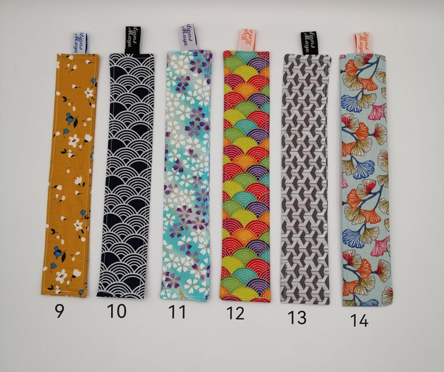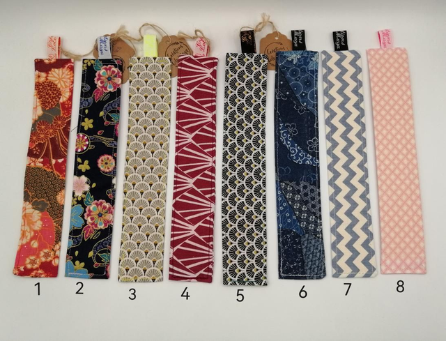 Marque-pages en tissu 23x5cm. Rigidifié par feuille cartonnée à l'intérieur. Ne pas laver.
