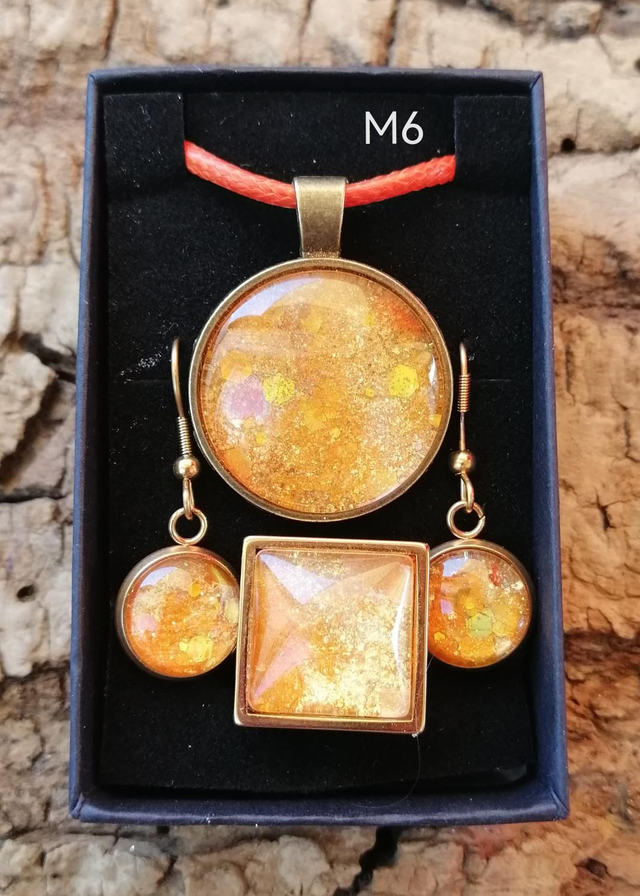 Tous les éléments ont un fond en Mica (pigment minéral). Parure de bijoux (en acier inoxydable) comprenant : 1 bague réglable (contemporaine) 1 paire de boucles d’oreilles (pendants de 3,5cm) 1 pendentif (avec collier en cordon ciré tressé de 50cm) La parure est présentée et vendue dans une boite cadeau noire (de 8cmx5cm).