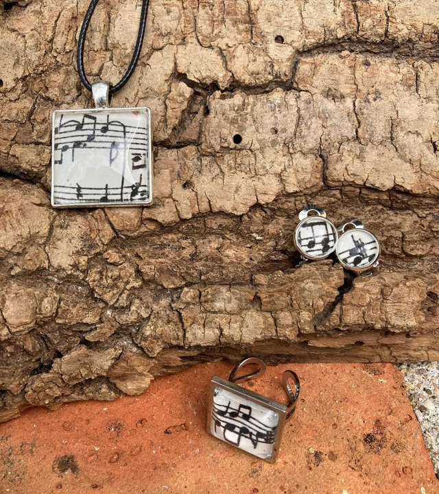 Tous les éléments ont un fond avec un motif de partition de musique.