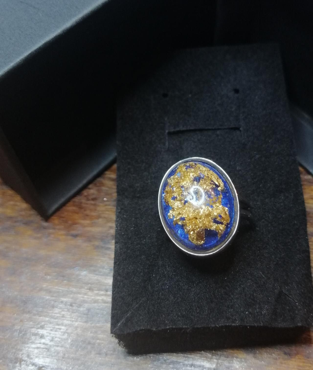 Bague moderne réglable avec incrustation de feuilles d’or véritable dans de la résine colorée.