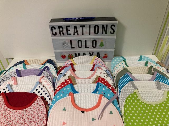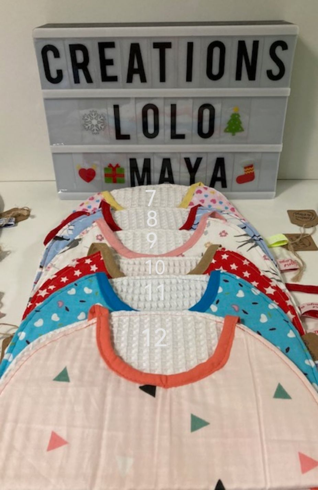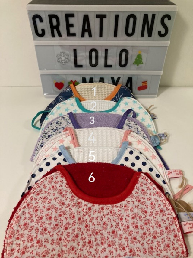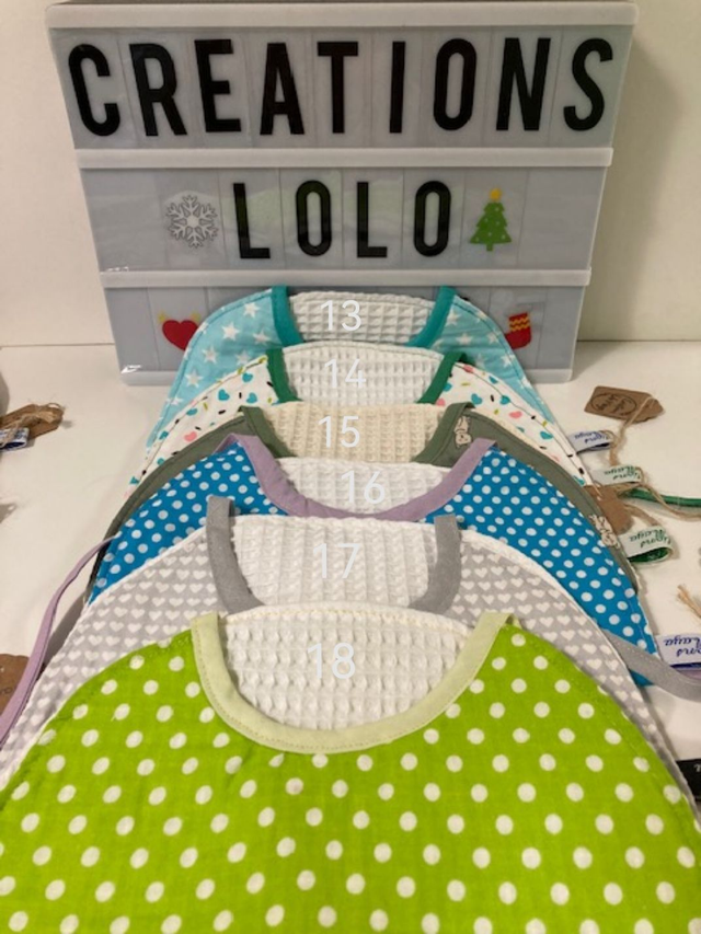 Bavoir bébé tout coton, verso éponge / éponge nid d'abeille. Fermeture par biais coton. 28x25cm.
